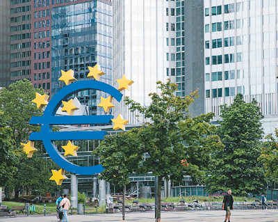 在德國(guó)法蘭克福拍攝的歐元標(biāo)志。