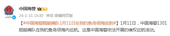 中新網(wǎng)1月11日電 據(jù)中國(guó)海警局官方微博消息,1月11日,中國(guó)海警1301艦艇編隊(duì)在我釣魚(yú)島領(lǐng)海內(nèi)巡航。這是中國(guó)海警依法開(kāi)展的維權(quán)巡航活動(dòng)。