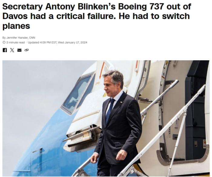 中新網(wǎng)1月18日電 據(jù)美國有線電視新聞網(wǎng)(CNN)報道,當?shù)貢r間1月17日,美國國務(wù)卿布林肯參加完達沃斯論壇從瑞士蘇黎世返程時,其乘坐的波音737飛機出現(xiàn)“嚴重故障”。