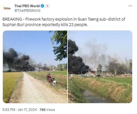 另?yè)?jù)泰國(guó)公共廣播服務(wù)公司下屬新聞網(wǎng)站“Thai PBS World”社交媒體賬號(hào)消息,當(dāng)?shù)貢r(shí)間17日,泰國(guó)中部素攀武里府一家煙花廠爆炸,目前已造成23人死亡,多人受傷。