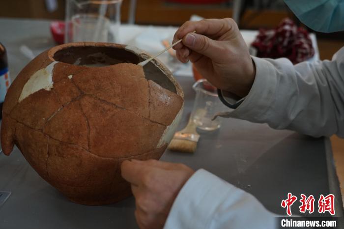 圖為正在被修復(fù)的陶器。 中新網(wǎng)記者李江寧 攝