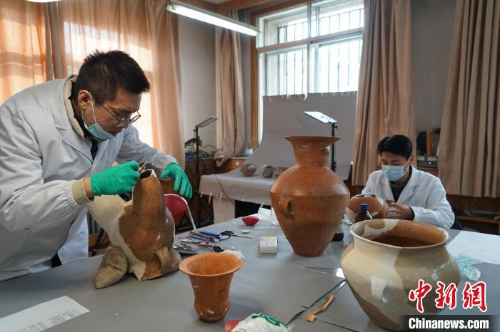 23日,中新網(wǎng)記者來到青海省文物考古研究院,看到文物修復(fù)工作室內(nèi),幾名年輕人正拿著修復(fù)工具小心翼翼地粘接碎陶片,大碎片如手掌大小,小碎片只有硬幣大小。工作臺(tái)上放置著幾件剛剛完成復(fù)原的陶器。