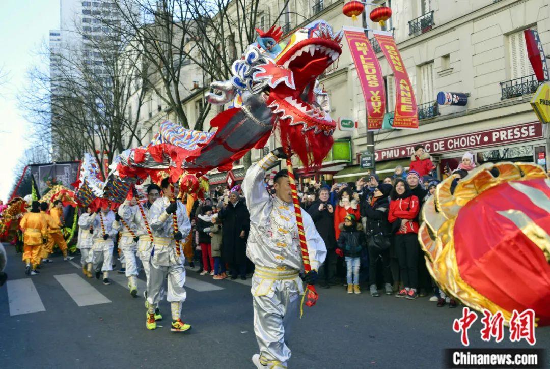 2018年,在法國(guó)巴黎十三區(qū)舉行的春節(jié)彩妝游行上,舞龍表演吸引市民圍觀欣賞。龍劍武 攝
