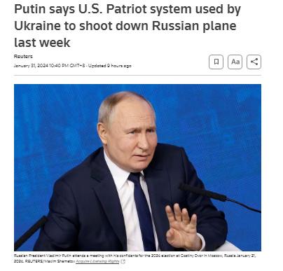 中新網(wǎng)2月1日電 據(jù)路透社報(bào)道,俄羅斯總統(tǒng)普京當(dāng)?shù)貢r(shí)間1月31日表示,俄方確認(rèn)此前載有被俘烏克蘭軍事人員的俄伊爾-76軍用運(yùn)輸機(jī)是被美制“愛國者”導(dǎo)彈系統(tǒng)擊落。