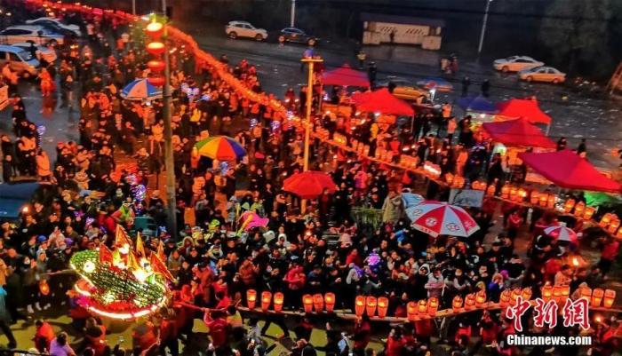 村民舞起由400余條板凳燈連接而成的近800米長(zhǎng)的梅燭龍燈繞村游走。陳斌 攝