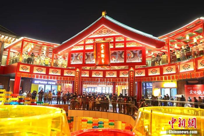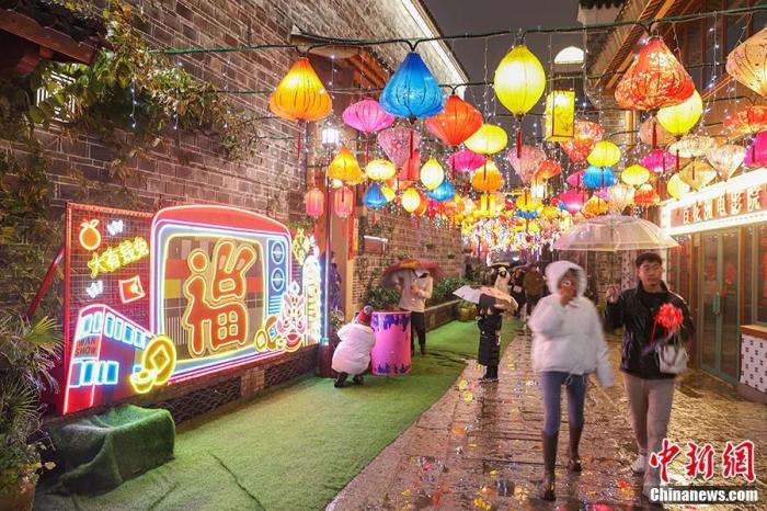 圖為無(wú)人機(jī)航拍古色古香年味十足的繩金塔歷史文化街區(qū),燈火璀璨,人潮涌動(dòng)?!⒘?攝