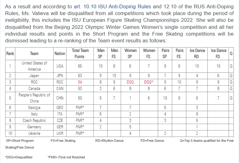 當(dāng)?shù)貢r間30日,國際滑聯(lián)對北京冬奧會花樣滑冰團(tuán)體成績進(jìn)行了重新計(jì)算,瓦利耶娃所獲得的成績積分被取消,俄羅斯奧委會代表團(tuán)在花樣滑冰團(tuán)體項(xiàng)目中的金牌變?yōu)殂~牌。