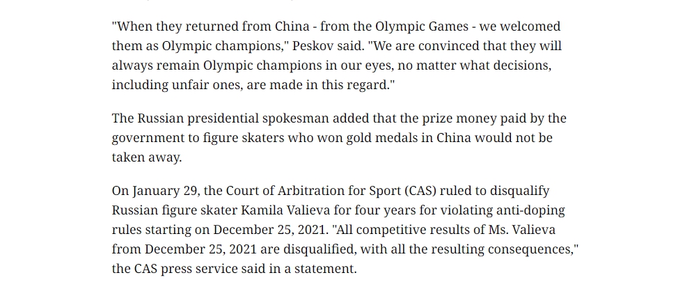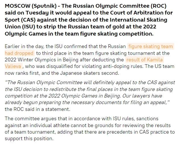 據(jù)俄羅斯衛(wèi)星通訊社報道,俄羅斯奧委會也在當(dāng)?shù)貢r間30日表示,將針對俄羅斯花滑運(yùn)動員卡米拉·瓦利耶娃被處以禁賽并取消北京冬奧會俄羅斯奧委會代表團(tuán)花滑團(tuán)體金牌一事,向國際體育仲裁法庭提起上訴。