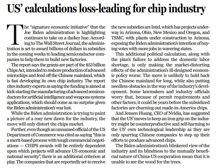 美國失策的經(jīng)濟(jì)政策本已造成市場(chǎng)扭曲,疊加出于政治意圖的算計(jì),以及補(bǔ)貼也無法解決的勞動(dòng)力短缺問題,這一切只會(huì)讓扭曲態(tài)勢(shì)進(jìn)一步惡化。此舉不太可能長(zhǎng)期遏制中國大陸,但卻給行業(yè)發(fā)展帶來種種不必要的障礙。美國部分國會(huì)議員及企業(yè)高管擔(dān)心,受到許可要求及其他因素影響,享受補(bǔ)貼的企業(yè)可能要花費(fèi)很多年才能生產(chǎn)出美國制造的芯片。