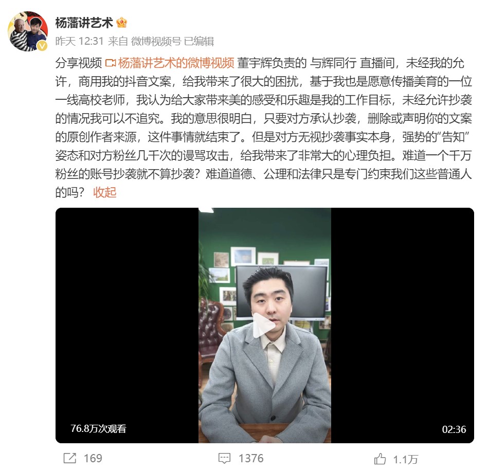 近日,擁有百萬粉絲的人文藝術博主楊藩發(fā)布視頻稱,“與輝同行”主播董董抄襲自己的視頻文案,再度將董宇輝直播團隊推上熱搜。