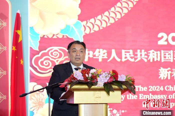 2月2日,中國駐菲律賓大使館在馬尼拉舉辦龍年新春招待會(huì)。圖為菲律賓代理外長多明戈現(xiàn)場宣讀菲總統(tǒng)馬科斯新春賀詞。中新社記者 張興龍 攝