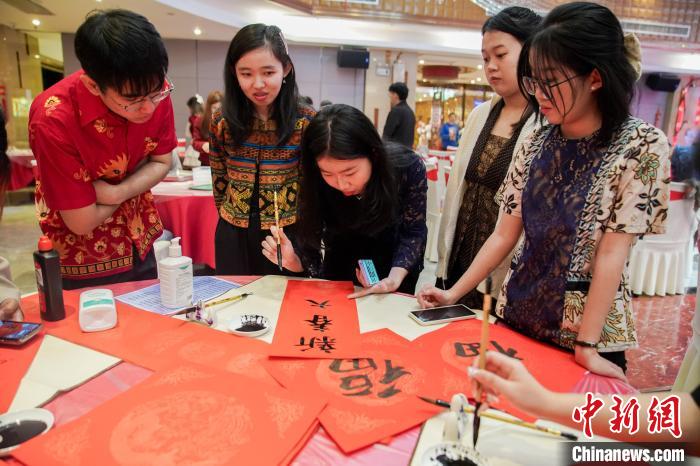 “一帆風(fēng)順年年好,萬事如意步步高”“喜迎新春鴻福到,吉慶祥和好運(yùn)來”……在春聯(lián)書寫區(qū),留學(xué)生們毛筆蘸墨,寫春聯(lián)、題“福”字,大家相互展示作品,互道新年祝福。