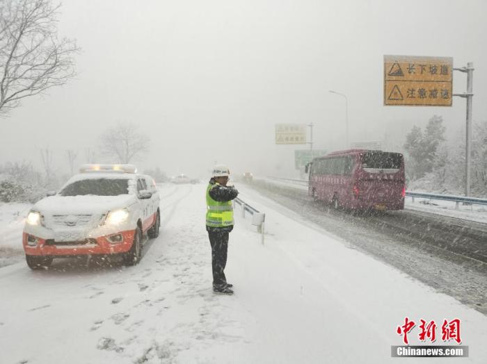 資料圖:二廣高速分水嶺路段突降大雪,路產(chǎn)人員雪中保通。 周鵬 攝