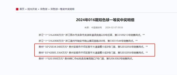 據(jù)中國福彩網(wǎng)顯示,在貴州省安順市52032056號銷售網(wǎng)點銷售的兩張一等獎中獎彩票中,一張彩票一等獎中獎數(shù)量為50注,中獎金額為25834.5400萬元,另一張中獎數(shù)量為83注,金額為42885.3364萬元。