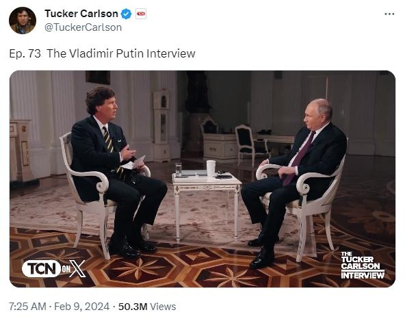 上線(xiàn)前,這場(chǎng)采訪(fǎng)就在世界范圍內(nèi)引發(fā)關(guān)注。有媒體稱(chēng),這次采訪(fǎng)或?qū)⒊蔀?022年烏克蘭危機(jī)爆發(fā)后,美國(guó)媒體人對(duì)普京進(jìn)行的首個(gè)正式訪(fǎng)問(wèn)。相關(guān)通告已在社交媒體上獲得了網(wǎng)友的上億次瀏覽量。