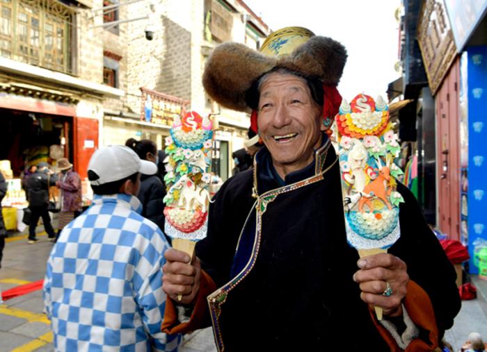 圖為:藏族老大爺手里拿著五彩酥油花“孜珠” 中新社記者 李林?jǐn)z