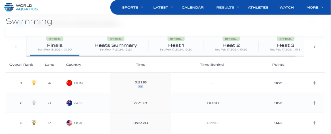 在預賽中,中國隊便狀態(tài)不俗,游出了3分24秒47的成績,打破了由日本隊保持的亞洲紀錄(3分24秒67),排名第一晉級決賽。