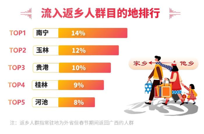 春節(jié)期間,廣西迎來客流高峰。據統(tǒng)計,廣西流入客流同比增長7%,流出客流同比增長18%,凈增客流超過1000萬人。其中,返桂人潮占比25%,男性成為返鄉(xiāng)主力,占比58%?!?0后”和“90后”人群成為返鄉(xiāng)主流,占比超過50%。交通出行方面,短途游備受青睞,200-500公里出行占比達到48%,汽車成為首選出行方式。