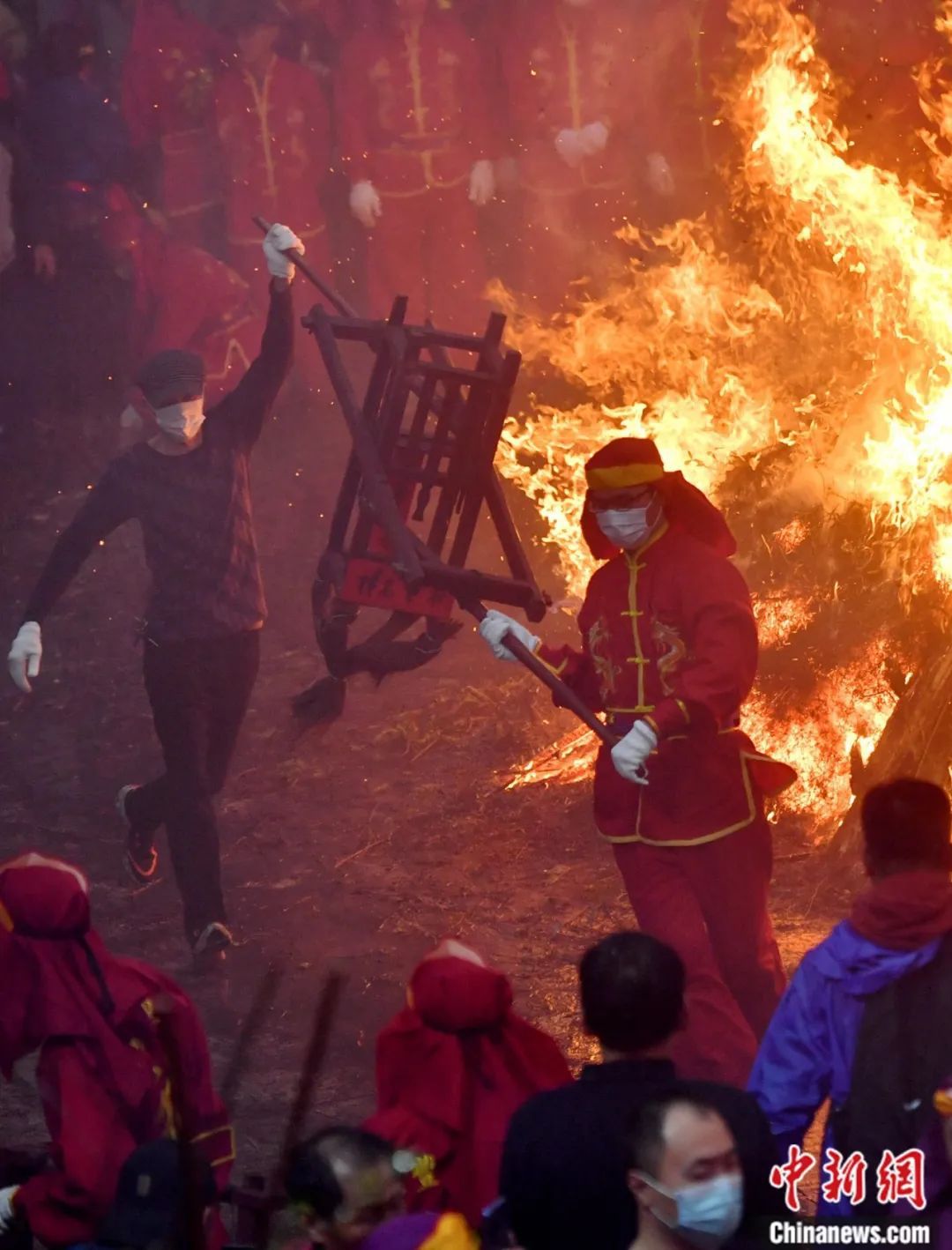 村民們抬著“古事棚”在村莊里狂奔。中新社記者 張斌 攝