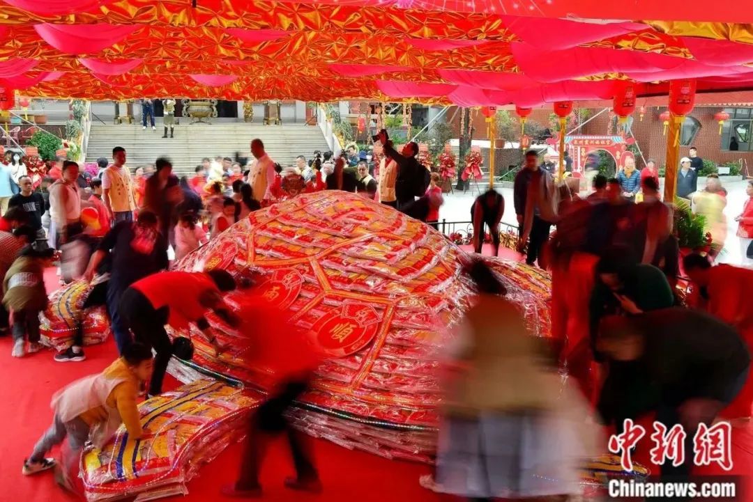 連城縣姑田鎮(zhèn)舉行被譽(yù)為天下第一龍的“游大龍”活動?!肮锰镉未簖垺敝两褚阉陌俣嗄隁v史,大龍選用當(dāng)?shù)刂摹肮锰镄垺睘椴牧?,最主要的龍頭及龍尾由當(dāng)年主辦家族承擔(dān)制作,其余由每戶各出一節(jié)自制的龍身,最終出游的大龍就是由這一節(jié)節(jié)龍身相接而成的。中新社記者 王東明 攝