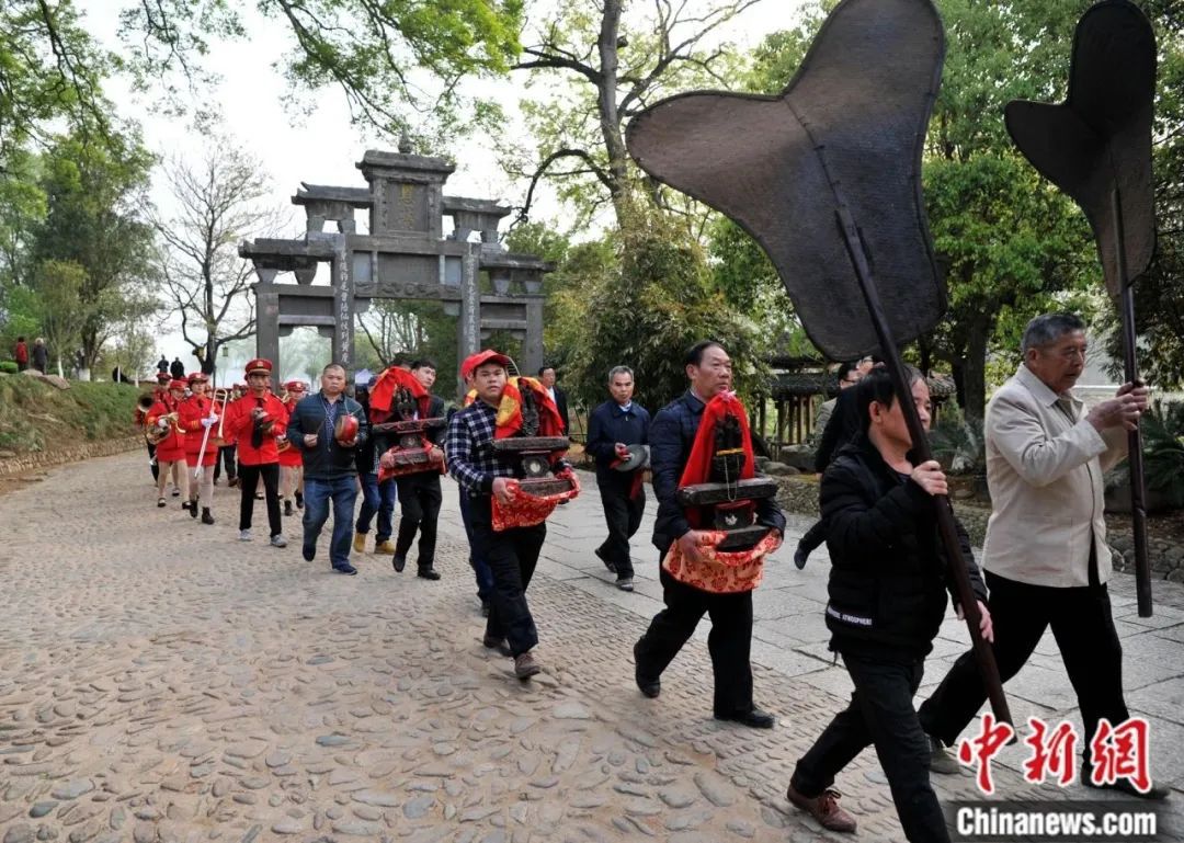 每年正月初十及正月二十六,潭頭鎮(zhèn)厚福村都會舉行傳統(tǒng)游神民俗活動,至今已有400多年的歷史。圖為傳統(tǒng)游神民俗活動中的巡游隊(duì)伍簇?fù)碇ι駥⒌娜俗呓执?。中新社記?呂明 攝