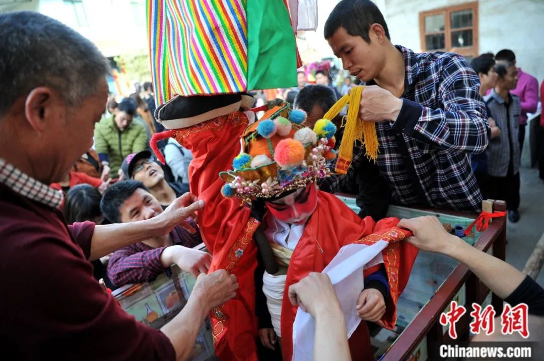 村民正在為參加“走古事”的兒童化妝穿衣。據(jù)了解,每個古事棚上有兩位身著戲袍,化上戲妝,扮成李世民、薛仁貴、劉邦、楊六郎、劉備等歷史人物的小朋友,入選的小朋友要求相貌端正,膽子大。中新社記者 張斌 攝