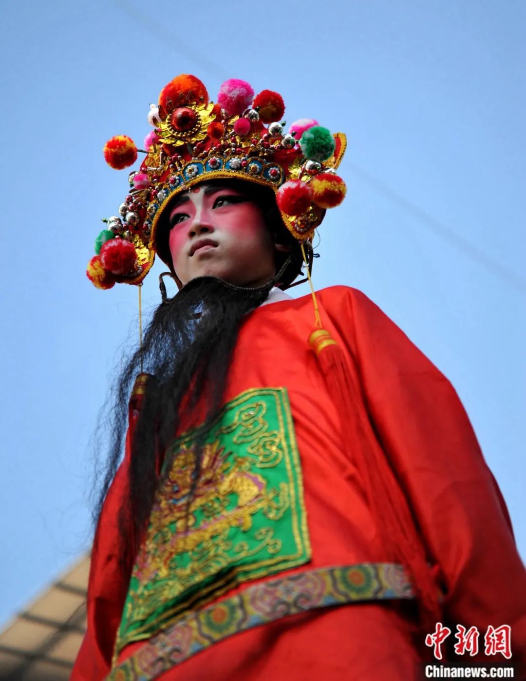 連城縣羅坊鄉(xiāng)舉行國家級非物質(zhì)文化遺產(chǎn),享有“中國客家狂歡節(jié)”美譽(yù)的“走古事”民俗活動。圖為立于轎臺之上參加“走古事”的兒童。中新社記者 張斌 攝