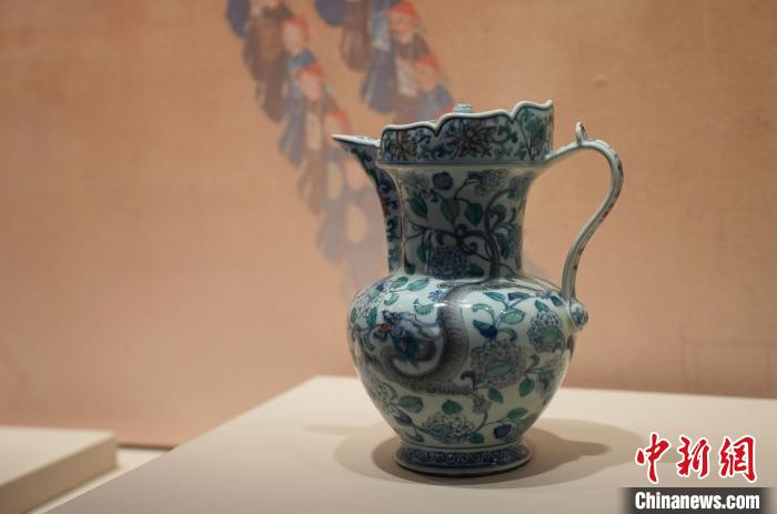 2月27日,正在“御瓷歸來(lái)”展覽上展出的“清乾隆時(shí)期斗彩螭龍穿花紋僧帽壺”?!⑺紓?攝