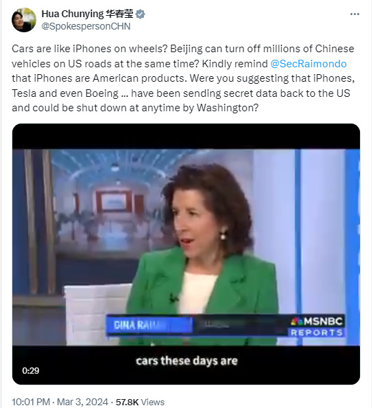 3月3日,華春瑩在社交媒體上發(fā)文回應美方這番言論,“汽車就像是裝了輪子的iPhone(蘋果手機)?北京能讓美國道路上的數(shù)百萬中國汽車同時熄火?友好提醒一下,iPhone是美國產品。你是不是在暗示iPhone、特斯拉甚至波音……一直在將機密數(shù)據(jù)傳送回美國,隨時可能被華盛頓關停?”