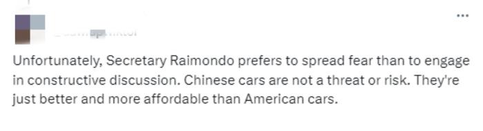 一名外國網(wǎng)友表示,雷蒙多喜歡“散布恐懼,而非進行建設性的討論”,而“中國制造的汽車比美國汽車更好、更便宜”。