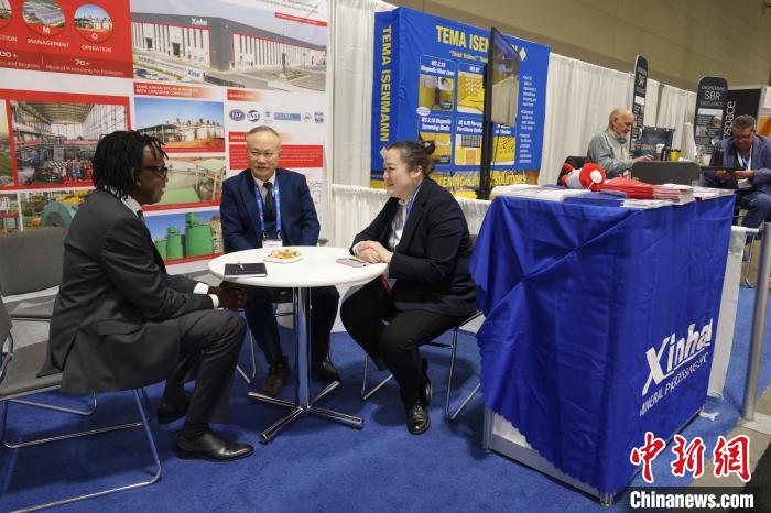 當(dāng)?shù)貢r間3月3日,2024年加拿大國際礦業(yè)大會(PDAC)在多倫多揭幕。圖為中國企業(yè)山東鑫海礦業(yè)技術(shù)裝備股份有限公司參展代表與客商洽談。中新社記者 余瑞冬 攝