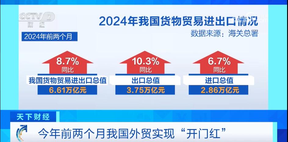 今年前2個(gè)月,我國貨物貿(mào)易進(jìn)出口總值6.61萬億元,同比增長8.7%。其中,出口3.75萬億元,同比增長10.3%;進(jìn)口2.86萬億元,同比增長6.7%。