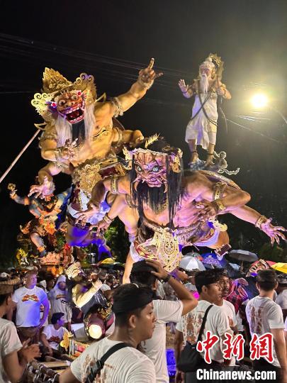 3月10日晚,巴厘島舉行盛大的“Ogoh-Ogoh”游行。隨著夜幕降臨,整個島嶼變得喧鬧起來,每個村落的男女老少都匯聚在一起,參與到這場充滿儀式感的游行中。在巴厘島市中心的一處廣場,抬“Ogoh-Ogoh”怪獸雕像的人們,伴隨著打擊樂和呼喊聲,將怪獸雕像晃動起伏,模仿怪獸行走的姿態(tài),讓這些由竹子、紙張和膠合板制成的雕像看起來活靈活現(xiàn)。