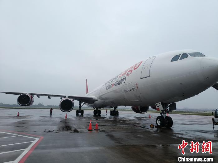 3月9日,由英國(guó)伯恩茅斯國(guó)際機(jī)場(chǎng)起飛的國(guó)際貨運(yùn)航班抵達(dá)海口。(海口美蘭國(guó)際機(jī)場(chǎng)供圖)