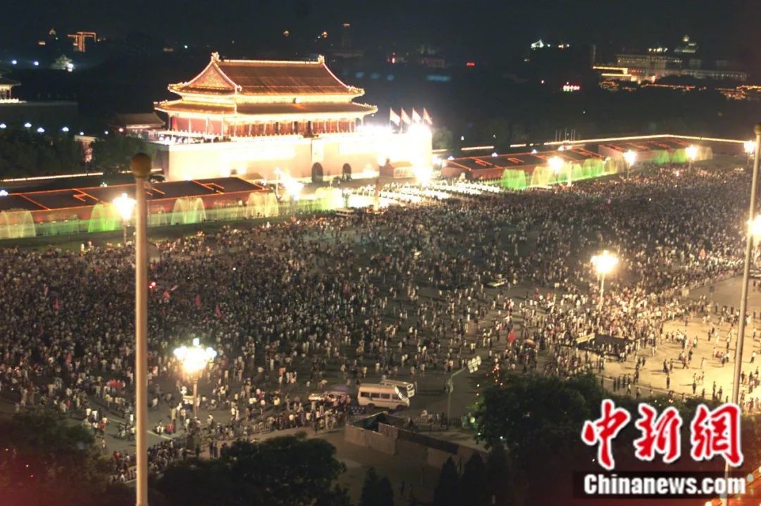 2001年7月13日晚,北京天安門廣場(chǎng)人潮涌動(dòng),數(shù)以十萬計(jì)的民眾徹夜不眠慶祝北京申奧成功。毛建軍 攝