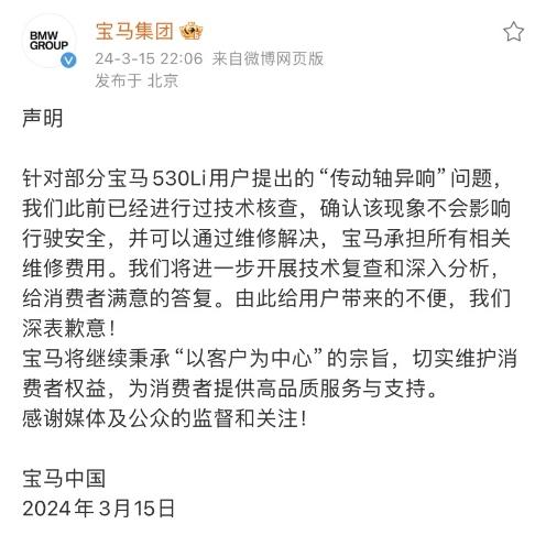 當晚,寶馬集團也發(fā)布聲明稱,“針對部分寶馬530Li用戶提出的‘傳動軸異響’問題,我們此前已經進行過技術核查,確認該現(xiàn)象不會影響行駛安全,并可以通過維修解決,寶馬承擔所有相關維修費用。我們將進一步開展技術復查和深入分析,給消費者滿意的答復。由此給用戶帶來的不便,我們深表歉意!”