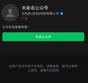 涉及主板機黑灰產業(yè)鏈的云機俠(深圳)科技有限公司,其微信公眾號顯示涉嫌違規(guī),賬號已被停止使用;其短視頻賬號已被相關平臺封禁;該公司官網目前也不能打開。