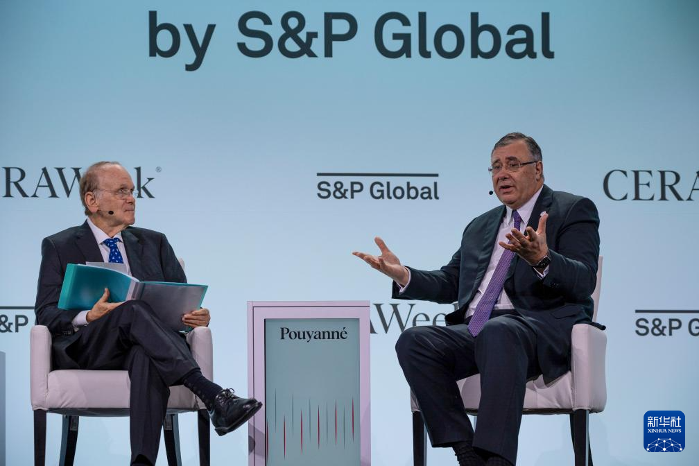 3月18日,法國道達(dá)爾能源首席執(zhí)行官帕特里克·普亞納(右)在美國休斯敦舉行的能源界高端會議“劍橋能源周”上分享觀點(diǎn)。新華社發(fā)(陳晨攝)