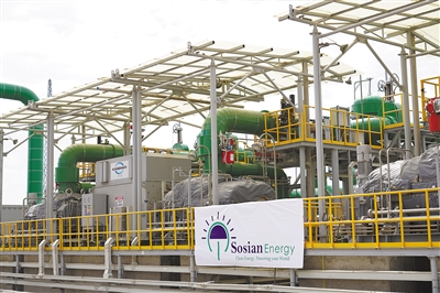 由中國(guó)企業(yè)承建的肯尼亞索西安地?zé)犭娬居谌ツ?月底投產(chǎn)送電,成為非洲首個(gè)從設(shè)計(jì)、產(chǎn)品生產(chǎn)到建設(shè)、調(diào)試完全由中國(guó)企業(yè)獨(dú)立完成的地?zé)岚l(fā)電站。該電站設(shè)計(jì)裝機(jī)容量35兆瓦,每年可減少二氧化碳排放24萬噸。圖為索西安地?zé)犭娬?號(hào)發(fā)電機(jī)組。