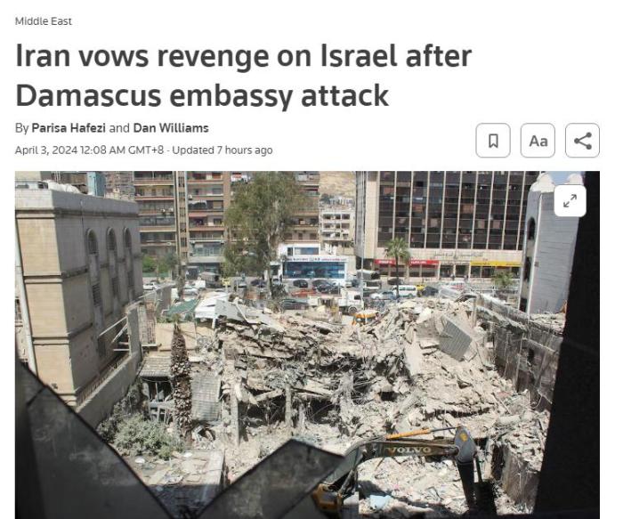 據(jù)此前報(bào)道,伊朗伊斯蘭革命衛(wèi)隊(duì)當(dāng)?shù)貢r(shí)間1日表示,伊朗駐敘利亞大使館領(lǐng)事部門建筑遭以色列襲擊,造成包括高級(jí)將領(lǐng)在內(nèi)的多名成員死亡。