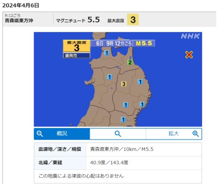 據(jù)報(bào)道,包括青森縣、巖手縣和北海道等多地均有震感,其中巖手縣盛岡市的震感最強(qiáng),達(dá)到震度3級。