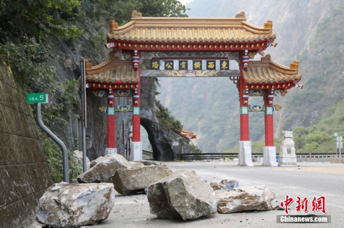 圖為位于太魯閣公園的中橫公路入口,立霧溪出??趦蓚?cè)山體有明顯滑坡痕跡。“東西橫貫公路”牌樓前,靠山體一側(cè)道路落滿大石。中新社記者 楊程晨 攝