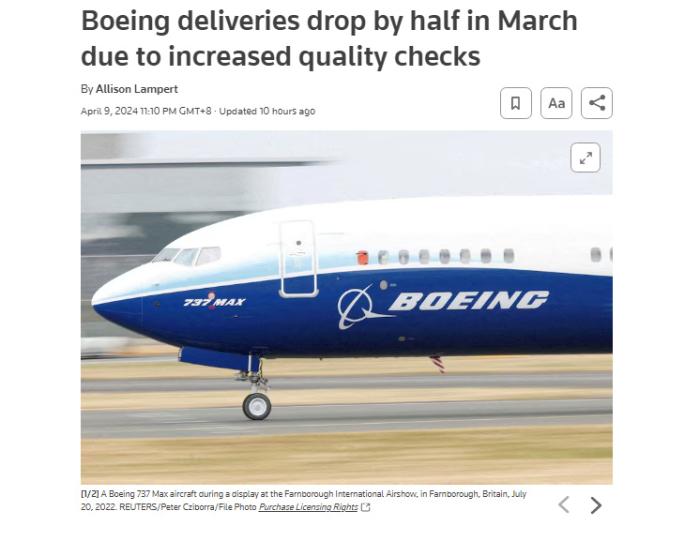 報道指出,波音公司3月收到了113架新飛機訂單。自2024年初以來,波音公司凈訂單總數(shù)為125架。