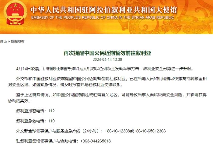 使館消息稱,4月14日凌晨,伊朗使用彈道導(dǎo)彈和無人機(jī)對(duì)以色列領(lǐng)土發(fā)動(dòng)軍事打擊,敘利亞安全形勢進(jìn)一步升級(jí)。