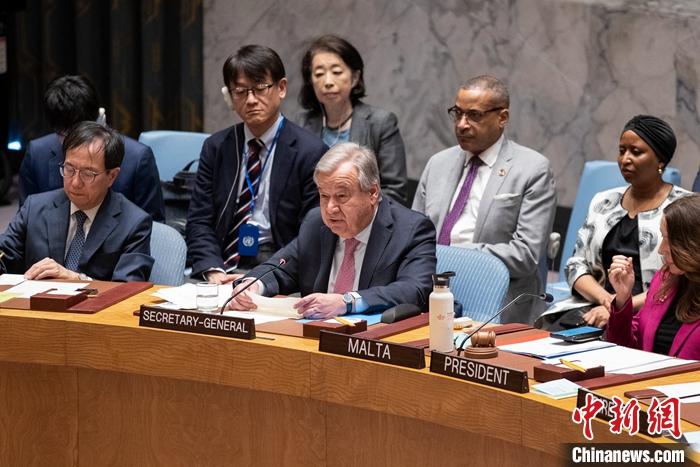 當(dāng)?shù)貢r(shí)間4月14日,聯(lián)合國(guó)安理會(huì)就伊朗襲擊以色列在紐約聯(lián)合國(guó)總部召開(kāi)緊急會(huì)議。圖為聯(lián)合國(guó)秘書(shū)長(zhǎng)古特雷斯發(fā)言。 中新社記者 廖攀 攝
