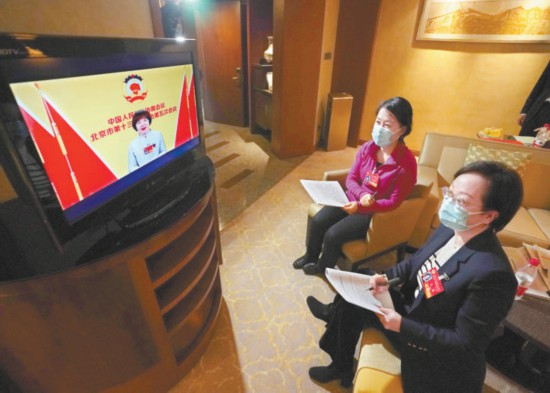 昨天晚上,市政協(xié)十三屆五次會議視頻播出大會發(fā)言,委員們在駐地各房間通過閉路電視、履職平臺APP收看。圖為民革界委員李鳳芹(右)和尤揚(左)在房間收看委員發(fā)言。本報記者 方非攝