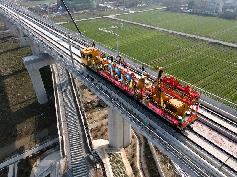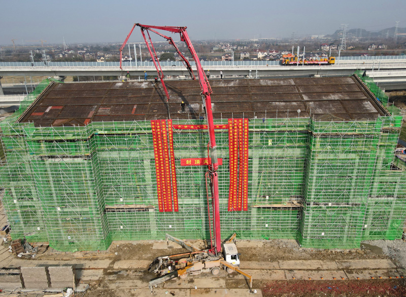 湖杭鐵路全線最大變電所封頂 首條接觸線架設(shè)
