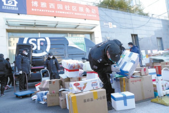 昨天上午,海淀區(qū)上地街道博雅西園社區(qū)門口,工作人員在幫社區(qū)居民轉(zhuǎn)運快遞。本報記者 王海欣攝