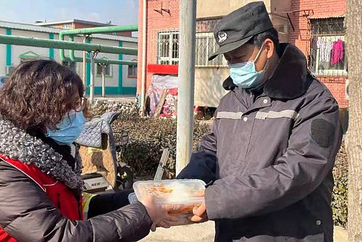 志愿者為核酸檢測點(diǎn)位送去餐食。寧河區(qū)供圖