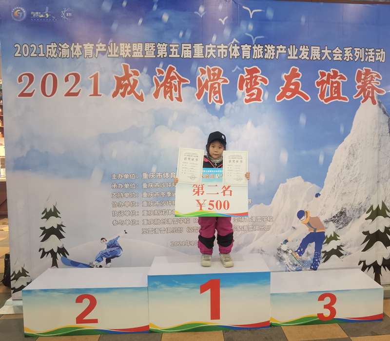 2021年夏天,萱萱迎來了第一場比賽——成渝滑雪友誼賽女子少年(U12)組比賽。當時4歲的萱萱是全場最小的參賽者,其他和她同臺角逐的都是8到12歲的小朋友。在平行回轉和坡面障礙兩個項目中,萱萱捧回了兩個第二名。